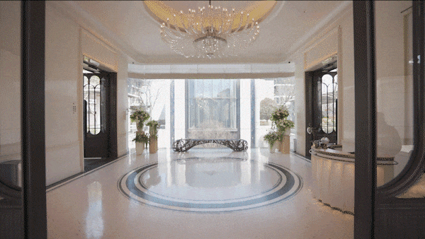 预接待厅的「威尼斯白+爵士白石材拼花」地面、E9级进口水晶灯,以手工匠艺致敬奢华质感。