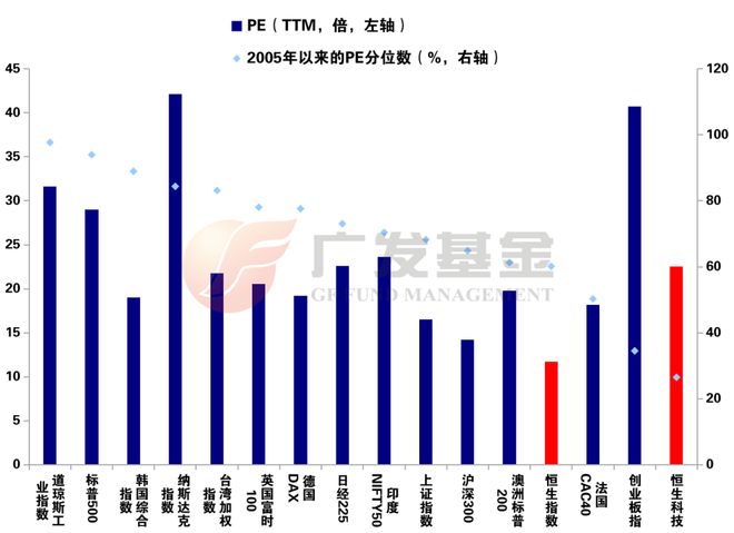 从估值角度来看,目前港股估值所处历史分位及全球视角相对不高,国际对比视角下港股估值仍相对较低。Wind数据显示,截至2025年11月7日,恒生指数和恒生科技指数的市盈率分别为11.87倍、22.69倍。